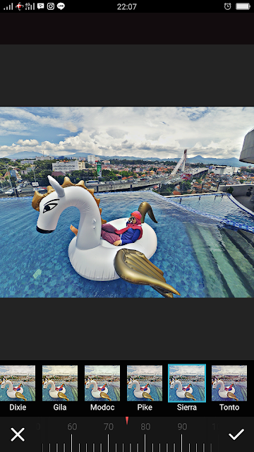 Aku masuk ke tema Colortune dan memilih filter dengan nama Sierra tentunya frekuensi warna filternya aku atur dan berhenti di titik 75,